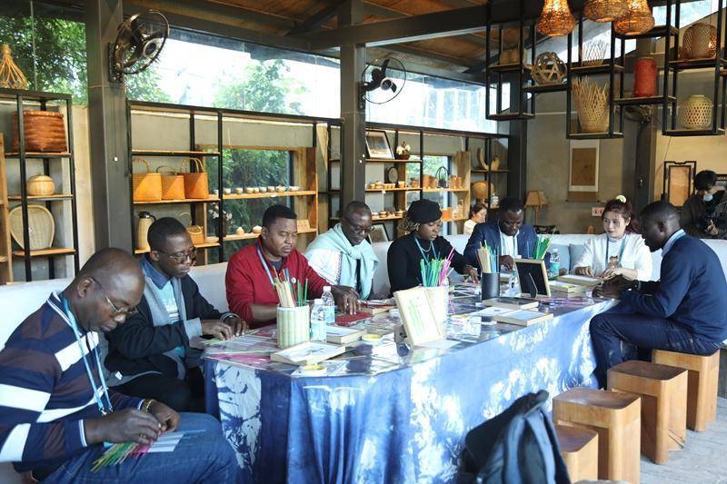 非洲游客们跃跃欲试,纷纷拿起竹条开始操作,专注地跟着步骤编织,时不时举起半成品向身边伙伴展示,脸上满是成就感,现场氛围轻松而热烈。大家不仅感受到传统手工艺的精巧匠心,更体会到瑶族人民生活美学的智慧,不少人将亲手编织的物件细心收好,作为此次古寨之行的珍贵纪念。